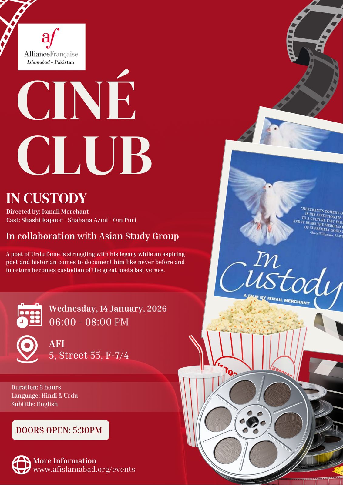 Alliance Française Islamabad, in collaboration with Asian Study Group, is pleased to present a screening of In Custody (1994), directed by Ismail Merchant and based on Anita Desai’s novel.